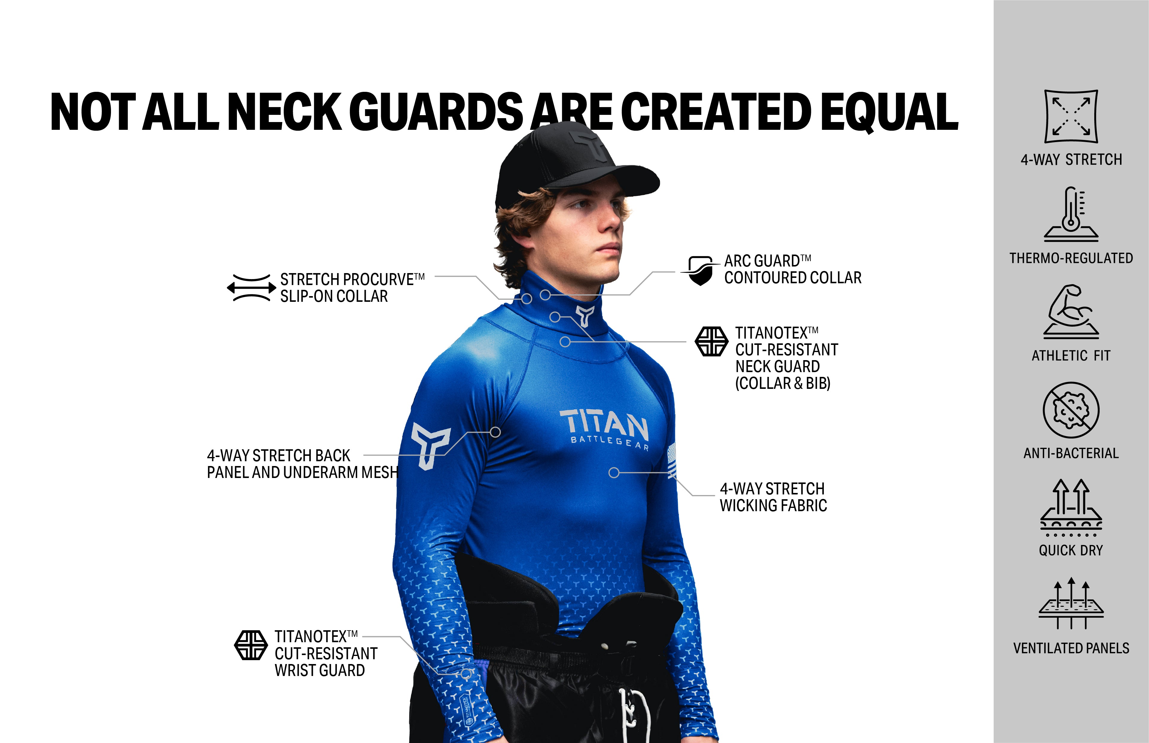 Titan's hockey neck guard shirt utilizes proprietary, American made fabrics, delivering the highest cut-resistance: level A9, which makes it 200 stronger than steel, and almost 5 times more cut resistant than Kevlar® products rated level 3 at 5N.